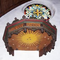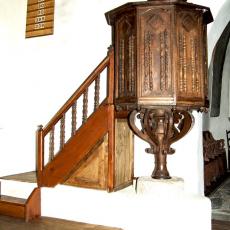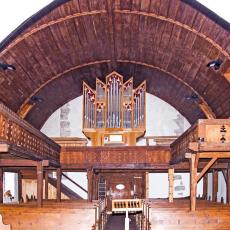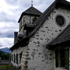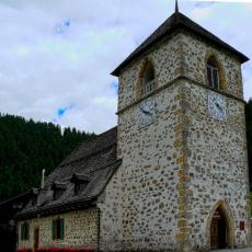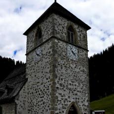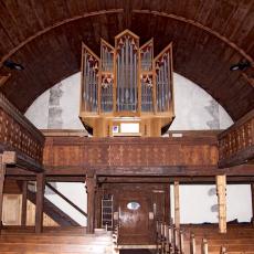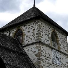 Edifice caractérisé par sa tour massive, sa toiture recouverte de tavillons, sa remarquable voûte en berceau lambrissé, ses trois galeries et ses bancs-poutres