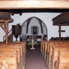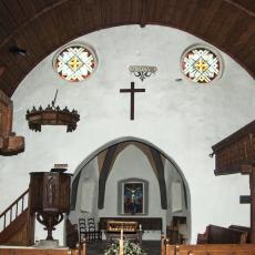 1709: plafond en berceau lambrissé, fenêtres rectangulaires dans la nef et dans le chœur munies de contrevents.