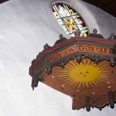 Deux vitraux héraldiques de 1580. Vitraux d'Alexis Guignard et Jean Schmidt (1945) et Bernard Viglino (1959). Peinture de Jacques Clavel «Le Sermon sur la montagne» de 1954.