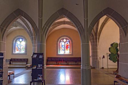 Ernest Biéler entwarf zwischen 1945 und 1950 die Fenster der Seitenschiffe. Diejenigen der westlichen Kapellen zeigen das Leben Christi, während die südlichen Fenster Themen des Alten Testamentes und die nördlichen des Neuen Testamentes aufgreifen. Informationen zum Künstler auch auf Wikipedia (französisch) und im Dictionnaire Historique de Suisse,