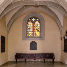 Im Innern bemerkt man die beiden mehrfarbigen Schlusssteine des Rippengewölbes. Der vordere stellt symbolisch die vier Evangelisten dar, vereint durch einen Kranz aus Akanthusblättern (4.,17 - 21), der hintere zeigt den die Kirche segnenden Christus, mit der Heiligen Jungfrau Maria zu seiner Rechten und wahrscheinlich dem heiligen Johannes der Täufer zu seiner Linken (4.13 - 16).