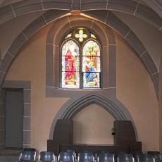 Das von Ernest Biéler entworfene und im Jahre 1900 durch den Glasmaler Hosch ausgeführte Kirchenfenster des Chores stellt den Kirchenpatron Sankt Martin dar, wie er seinen Mantel teilt (4.04 + 05). Hinweise zu E. Biéler s.o. (Fenster in den Seitenkapellen), ebenso bei Informationen zur Orgel auf Orgues & vitraux