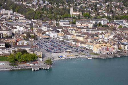 Luftbild von Vevey mit dem zentralen Platz am See und St. Martin