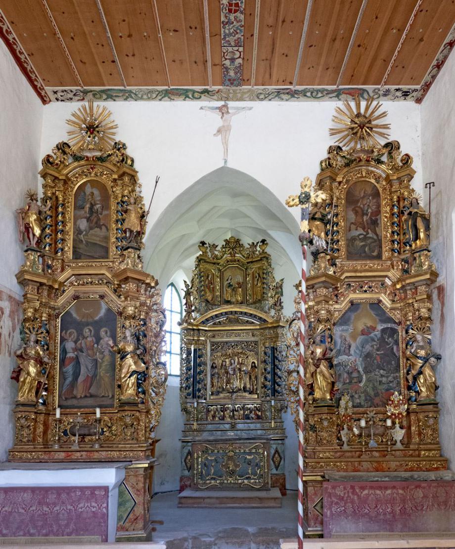 Hans Ardüser, der Schulmeister, Chronist und Wandermaler, malte einen monumentalen Christophorus am Turm. Sein Anblick sollte die Gläubigen bei einem plötzlichen Tod beschützen. Die Memminger Werkstatt des Ivo Strigel lieferte 1506 einen gotischen Flügelaltar. In der Predella wurde in drei Feldern Christi mit den 12 Jüngern als Halbfiguren verewigt. Im Schrein sind neben Maria mit dem Kind auf der linken Seite Johannes der Täufer mit einer Bibel und dem Lamm und der heilige Sebastian als modischer Ritter. Rechts folgen der heilige Georg mit der Lanze und der Pestheilige Rochus mit Stab.