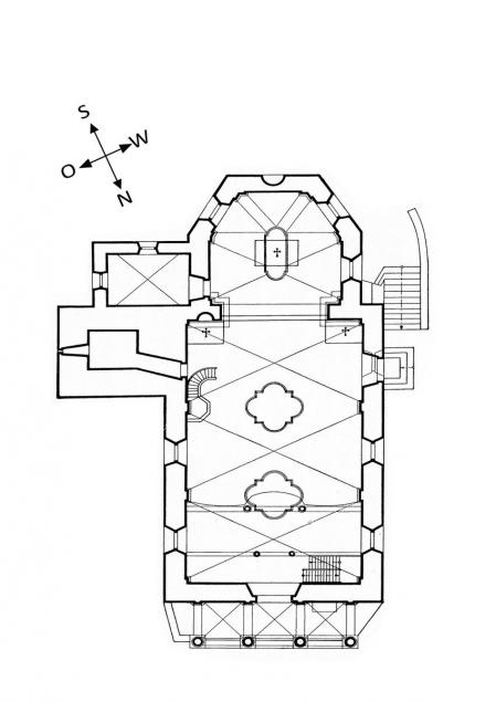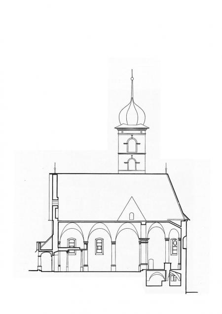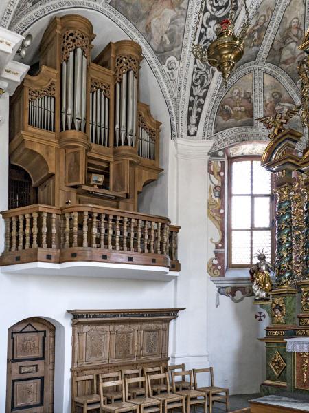 Die nach Süden gerichtete Barockkirche wurde Mitte des 17. Jahrhunderts an der Stelle von zwei Vorgängerbauten errichtet, von denen nur die originale Eingangstüre mit den Schnitzereien übernommen wurde. In der Vorhalle befindet sich ein bemerkenswertes aber auch schockierendes Beispiel eines gemarterten Christus am Kreuz.