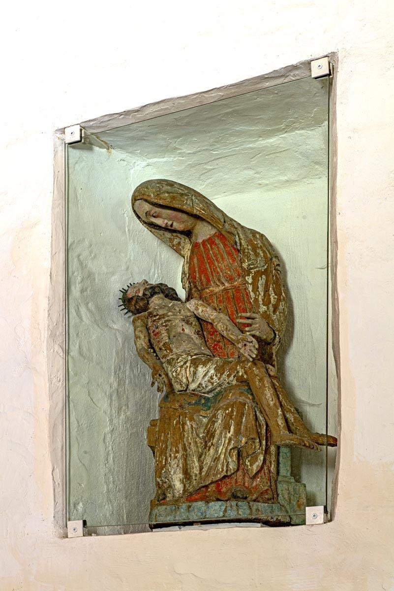 "In einer Nische der Nordwand ein hochgotisches Vesperbild aus Holz, H. 110 cm, hinten ausgehöhlt und mit Deckbrett verschlossen. Zwei der Finger Christi fehlen. Der Umriss umfliesst die Figur wie eine sich neigende Welle; um 1360—1370. Neu bemalt, Sternchen und Schwerter spätere Zutaten. Das Bildwerk stand vor der Reformation vermutlich in Duvin(Dies wohl der wahre Kern der Überlieferung, dass die von den Duvinern in das Tobel geworfene Figur von den Peidnern bei der Einmündung des Baches in den Glenner herausgefischt worden sei.)"