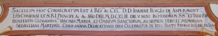 SACELLUM HOC CONSECRATUM EST A REV AC. CEL. D. D. JOANNE FLUGIO DE ASPERMONT ERO CURIENSI ET S.R.I. PRINCIPE ANNO DNI. MDCXLIII DIE V SEPT. [05.09.1643] IN HONOREM SS. ET INDIVIDA TRINITATIS GLORIOSIS VIRGINIS MARIA ET OMNIUM SANCTORUM, AD NOMEN VERO ET MEMORIAM SEBASTIANI MARTYRIS. CUIUS ANNUA DIES CELEBRATUR IN IPSO FESTO PATROCINIJ DIE XX IAN