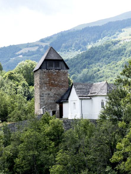 Die dem Märtyrer Laurentius gewidmete Kirche liegt -weitherum sichtbar- auf dem Burghügel zwischen Glenner und Valserrhein. Die Burg ist verschwunden. Einzig der Bergfried steht noch und dient seit 1515 als Kirchturm für das damals errichtete Gotteshaus.