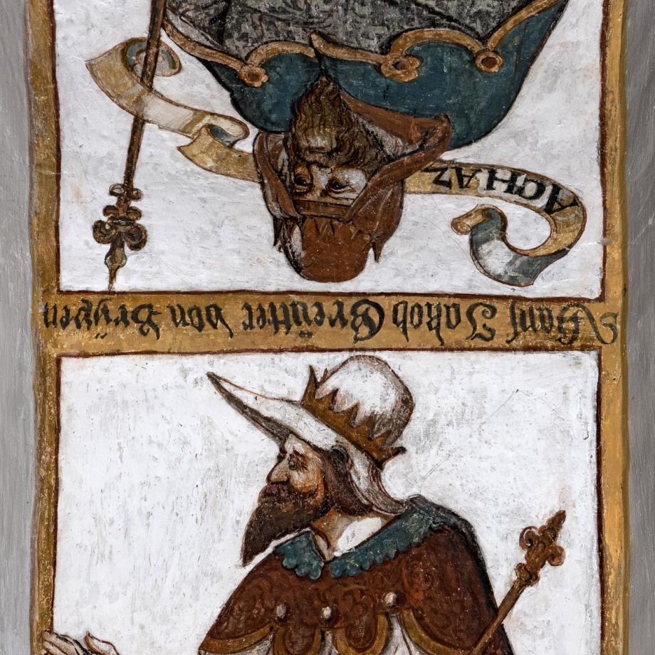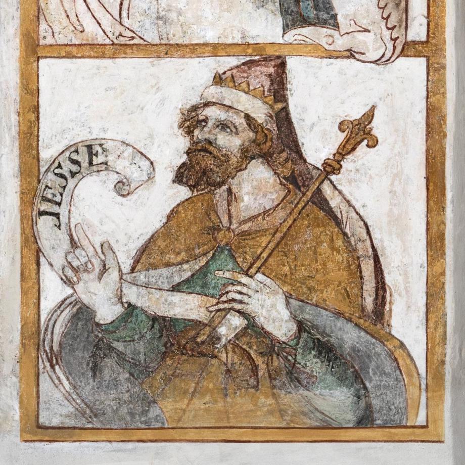 In der Leibung des Chorbogens zwölf Halbfiguren von Vorfahren Christi (nach Matth. I, V. 6—11), deren Namen auf Schriftbändern stehen [Namen] Im Scheitel des Bogens steht die Signatur des Malers: „M(aller) Hans Jakob Greutter von Bryren“. Die Reihenfolge ist z. T. willkürlich: beginnen sollte die Folge mit Jesse, David, Salomon; ferner ist Joatam (Jotham) zwischen Usia und Ahas einzustellen.