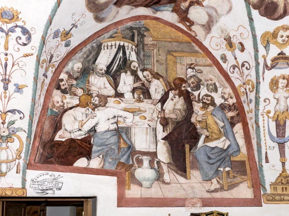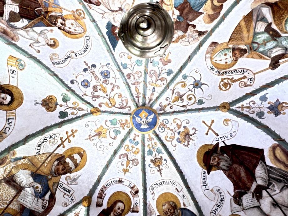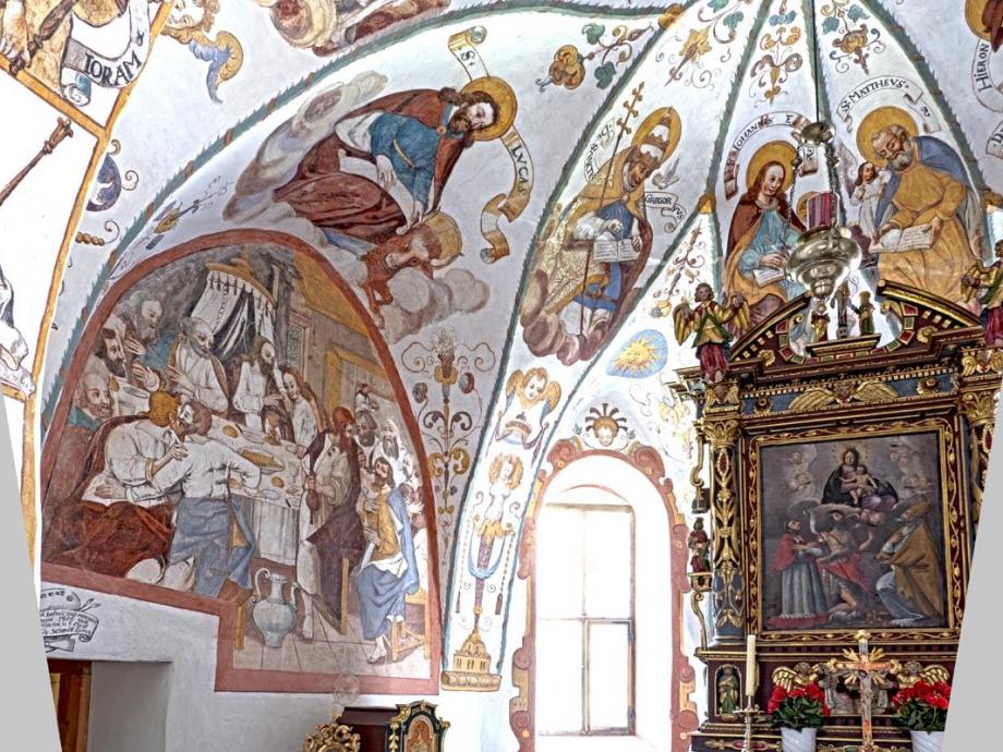 In den Schilden der Längswände westlich das Abendmahl, östlich Gethsemane, signiert „HIGM"(Hans Jakob Greutter Maler). An der Abschlusswand das Datum 1616. Die architektonischen Linien des Gewölbes sind von Laubgewinden betont, und aus den Zwickeln wachsen in gotisierender Art Blumen- und Blattranken. In den Feldern die Gestalten der Evangelisten und der vier abendländischen Kirchenväter, auf Wolkenballen sitzend, sowie zwei posaunen blasende Engel. Die Namen stehen auf geschwungenen Schriftbändern. (Poeschel)