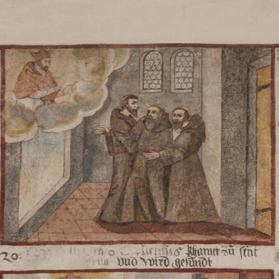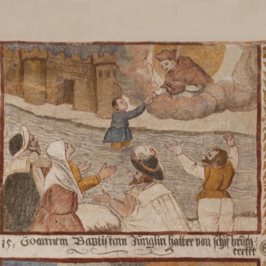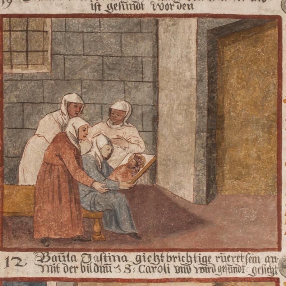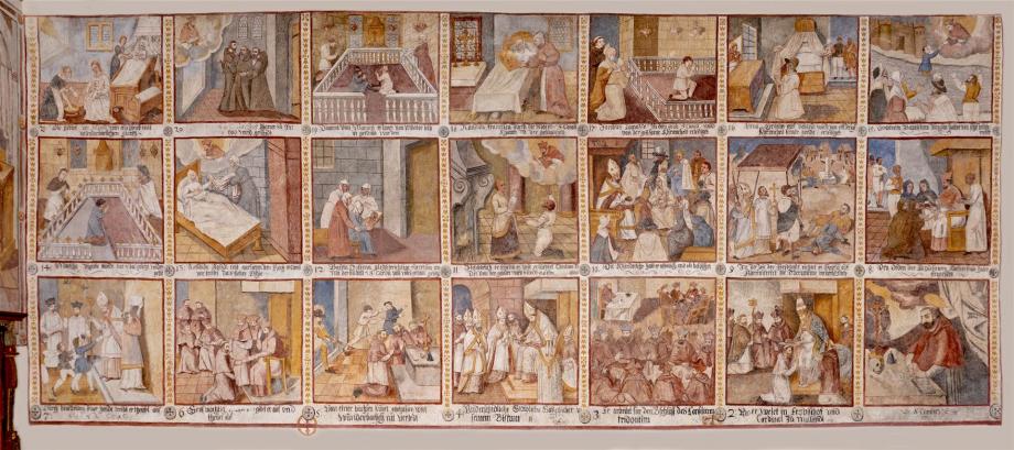 An der Nordwand des Schiffes von etwas späterer Hand ein Zyklus zur Verherrlichung des S. Carlo Borromeo, in drei Reihen von je sieben annähernd quadratischen Feldern, durch erklärende Unterschriften erläutert. Die Reihenfolge ist numeriert und beginnt rechts unten mit einem Bildnis des Heiligen. Dann folgen zehn Darstellungen aus dem Leben des S. Carlo, seine Wahl zum Kardinal und Erzbischof von Mailand, die Teilnahme am Tridentiner Konzil, Errettung vor dem Anschlag der Humiliaten, bischöfliche und seelsorgerische Tätigkeit des Heiligen sowie die Entsendung von geistlichen Visitatoren und Kapuzinermissionen, Exorzismen, Besuche bei Pestkranken und Kinderlehre; hierauf schildern zehn Bildchen Wunderwirkungen durch die Fürbitte des S. Carlo nach dessen Tod, und als letztes — auf den Anfang zurückgreifend — die von wunderbarem Glanz umstrahlte Geburt des Heiligen. Es sind Schildereien im Stil einer Bilderbibel, qualitativ unter dem Niveau von Greutters Malereien im Chor, jedoch ikonographisch und hagiographisch bemerkenswert. Mitte des 17. Jahrhunderts. (Poeschel)