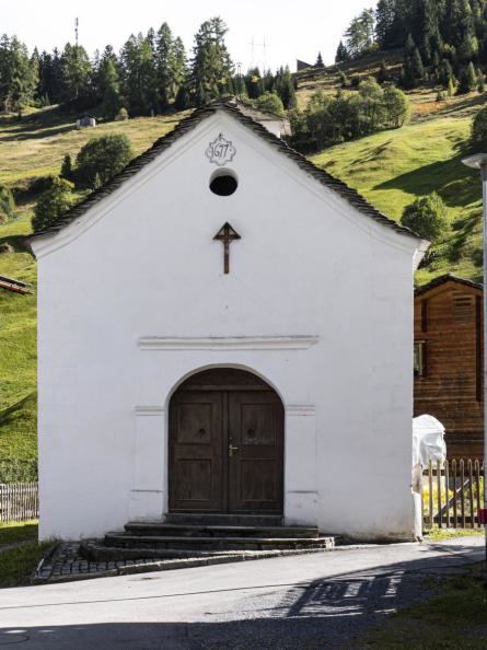 Hans Batz merkt an, dass die Kapelle im Ortsteil Valé südlich von Vals-Platz, umgeben von einem Gemüsegarten und alten Bauernhäusern, steht. Von der Ferne ist sie kaum erkennbar...