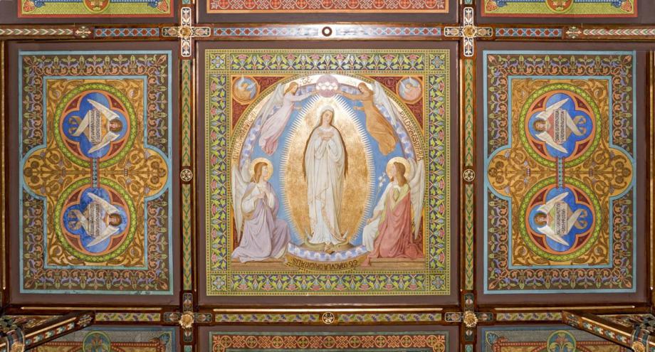 Maria als Immaculata auf Mondsichel stehend und der Schlange den Kopf zertretend. Links und rechts von Maria kniet ein Engel mit Lilienstengel; darüber schwebende Engel, ein Sternendiadem über dem Haupte Mariens haltend; Inschrift in einem Buch rechts oben beginnend: TOTA PULCHRA ES MARIA. Unten. ET MACULA ORIGINALIS. Links: NUMQUAM FUIT IN TE. Die Seitenfelderanordnung entspricht der bei 2