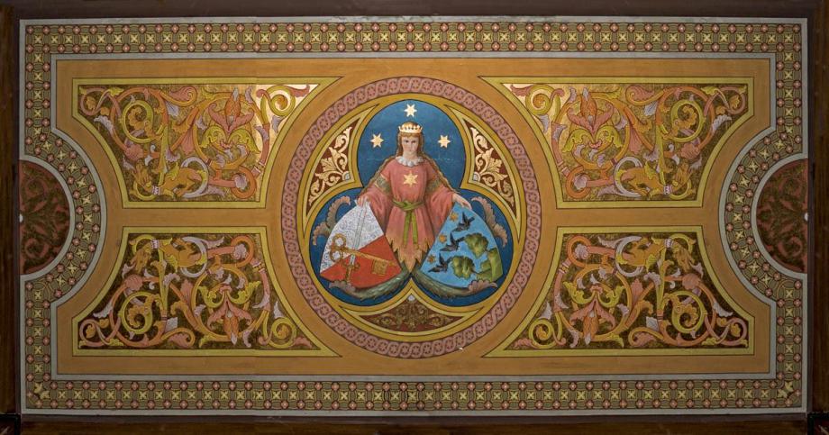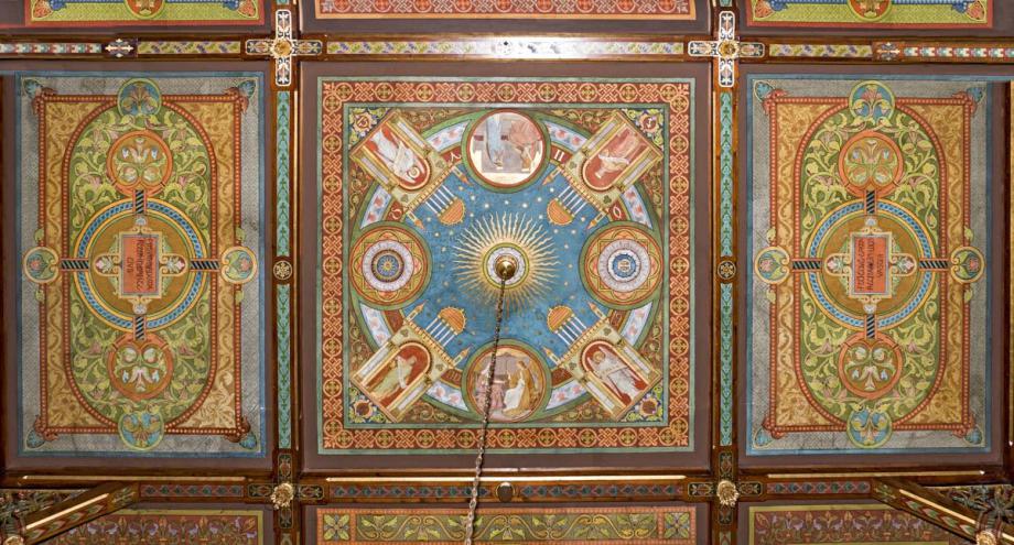 Blicken wir jetzt zur Decke des Mittelschiffs. Sie bildet eine Felderdecke. Diese ist gegliedert durch zwei Längsbalkenreihen und fünf Querbalken, die alle fein verziert sind, vor allem wo sie sich überschneiden. Geschnitzte, durchbrochene und polychromierte Streben verbinden und festigen die Mittelschiffhochwand mit der Decke, die vorne und rückwärts wie auch auf den Seiten von Balken und Streben umrahmt ist. Auf der Flachdecke des Mittelschiffs beginnen die Gemälde über der Orgeltribüne.