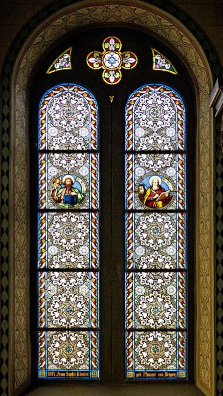 In den Glasgemälden der Stirnwand erkennen wir durch das jeweilige Schriftband die vier Evangelisten. Sie ordnen sich von links nach rechts ein, zeigen einen schematischen Aufbau und sind weiters erkenntlich durch ihr Attribut. Jeder hält einen Gänsekiel in der Rechten, in der Linken umfaßt er ein Buch.