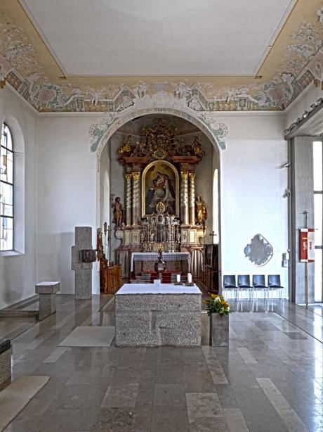 3.05 - 07: Tabernakel / 3.08 - 3.13: Altar und Altarkreuz / 3.14 + 15: Ambo - von Bildhauer Alfred Appenzeller aus Altheim, von Friesinger und Metzger aus Kressbronn in Muschelkalkstein ausgeführt. Zwischen Altar und Nordwand steht ein einfaches schmales Stahlrohrkreuz mit einem frühbarocken Kruzifixus.