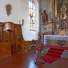 An der alten Chorbogenwand befanden sich bis zur Renovation 1971 zwei barocke Seitenaltäre, rechts ist heute ein Epitaph des Pfarrers Franz Georg Löscher (1751-1769) in die Wand eingelassen. Der nach Osten gerichtete Chor der alten Kirche erschließt sich dem Betrachter erst beim Betreten des Altarraumes. Dieser Raum besitzt eine flache barocke Stuckdecke mit einem Mittel- und vier Eckbildern und farbige Glasfenster aus dem frühen 20. Jahrhundert. In ihm befinden sich ein reich mit Intarsienarbeiten geziertes Chorgestühl, mehrere Skulpturen unterschiedlicher Stilrichtung und Qualität sowie als künstlerischer Höhepunkt der gesamten Kirchenausstattung ein barocker Säulenaltar mit künstlerisch wertvollen Gestaltungselementen zu Ehren des Rosenkranzes und der Eucharistie nach der Tradition des Dominikaner- ordens.