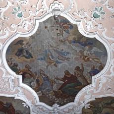 3.16 - 19: eine den ganzen Raum umlaufende gewölbte Deckenkehlung mit stuckiertem Flachrelief aus Putten, Blumengewinden, Vasen, Draperien und allegorischen Darstellungen aus der ersten Hälfte des 18. Jahrhunderts.