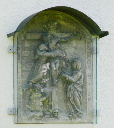 An der Nordwand der Kapelle befindet sich das bedeutendste ortsgeschichtliche Bildwerk der Gemeinde, eine Kalksteintafel. Sie zeigt das Bildnis des Stifters kniend am Fuß des Kreuzes; darüber der Hl. Franziskus, der den Herrn am Kreuz umfängt und seitlich die fürbittende Muttergottes. Unter dem Kreuz sind die drei markantesten Gebäude des Dorfes, links die Kirche, das Schloss und rechts das sogenannte Steinhaus abgebildet. Laut Signatur „IZDI 1622" war Johannes Zürn der Jüngere, Bildhauer aus Waldsee, der Schöpfer des Gedenksteins.