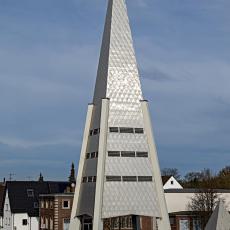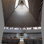 an der Nordwestwand, ursprünglich als Sakramentskapelle gedacht, wird erleuchtet durch das Glasbetonfenster. Es zeigt einen liegenden Lebensbaum in Rot auf Weiß und will den sich-hingebenden Christus am Kreuz versinnbilden: Die Liebe Gottes, die sich für uns hergibt.