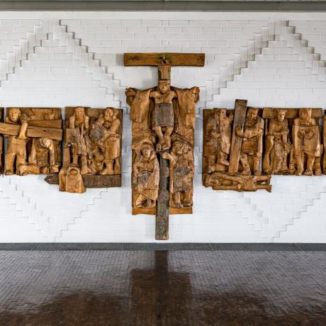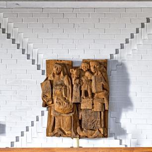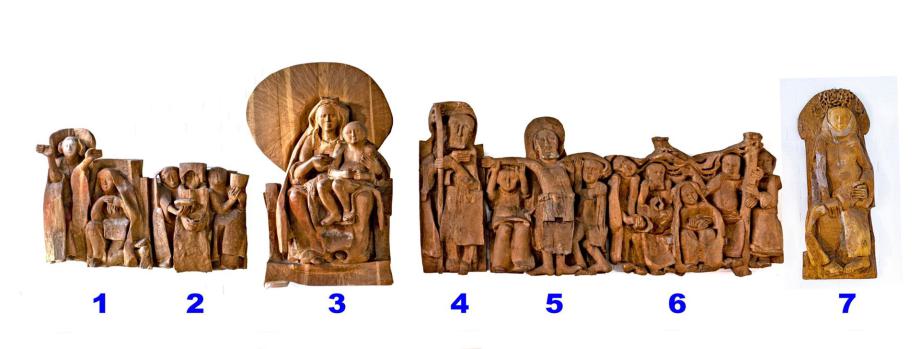 Der Marienfries ist eine Darstellung der Sieben Freuden Mariens und auch unserer Freuden. Die beeindruckende Großplastik hat sieben Einzeltafeln, aus 400 Jahre altem Eichenholz geschnitten. Die Figurengruppen rufen in unser Gedächtnis und unser Erinnern: