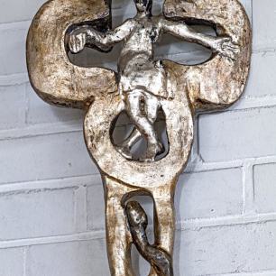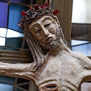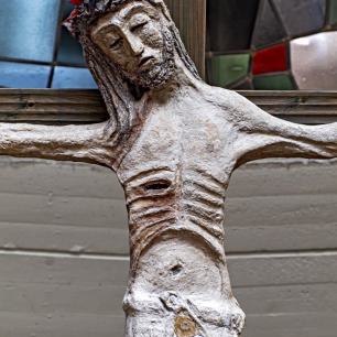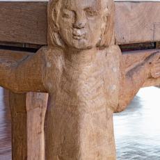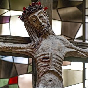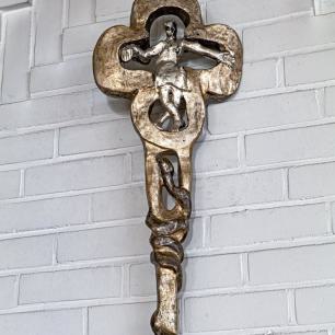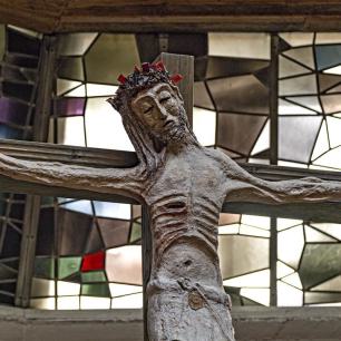 (der Christus-Corpus stammt aus dem rheinischen Raum, etwa um 1740) ist von Wendelin Matt gestaltet worden als Segen-Zeichen „Tau", des letzten Buchstabens im semitischen Alphabet: „Mein bist du, ich habe dich gezeugt" (vgl. Ez 9,4 / Apk 7,3), spricht Gott zu jedem neugeborenen Menschenkind. In die Kreuzbalken sind Durchbrüche gebrochen wie Tore zur Auferstehung, darinnen kleine Broncefiguren, die Totenerweckungen darstellend von Lazarus, von des Jairus' Töchterlein, vom Jüngling aus Nain. Im Kreuz sind auch wir zum Leben erweckt!
