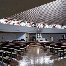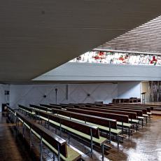Der „Christusmaler" Roland Peter Litzenburger (1917-1986) hat das Glasband, das sich um den ganzen Innenraum zieht, in mystisch-blau-violetten Tönen gestaltet: Das Netz ist ausgeworfen (die Ruten der Bleiverglasung), Fische sind darinnen, die alle der Mitte Christus zuschwimmen, von seinen dunkelroten Wundmalen angezogen. Des Weiteren entwarf Litzenburger in kräftiger Glasbeton-Manier das Columbansfenster (in der Südostecke), das Tauffenster (an der Westwand) und das Fenster in der heutigen Marienkapelle.