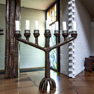 (rechts von der Bundeslade) ist ebenfalls mit irokeltischen Ornamenten geschmückt und trägt die Kerzen, die sieben Flammen des Herrn. Nach alter jüdischer Überlieferung heißen die Flammen: Gott, Hunger, Durst, Sprache, Leidenschaft, Musik / Tanz, Flamme der Liebe.