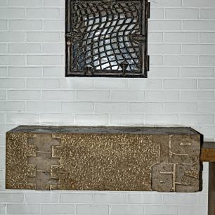 in Bronce, bis dahin erstmalig in der Gestalt der alttestamentlichen Bundeslade. Vier Väter/Evangelisten tragen den kostbaren Schrein, der das heilige Sakrament birgt. Flache Reliefs am Tabernakel beschreiben die Heilsgeschichte des alten und neuen Bundesvolkes: Das Osterlamm, das, sich-selbst-hingebend, andere rettet; das Manna als Überlebensbrot in der Wüste; die zerbrochenen Gesetzestafeln, die das jetzt gültige Gebot der Liebe verkünden; die Wachteln als Speise für das hungernde Volk; der brennende Dornbusch als Gottes Gegenwart; die Eherne Schlange, die mit ihrem Gegen-Serum heilt (ein Vorzeichen für Christus am Kreuz). Die Rückseite des Schreins zeigt die Ägyptischen Plagen, aktualisiert als Umweltgefahren und Lebensbedrohungen heute.
