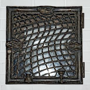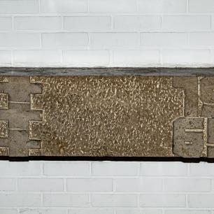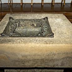 in die Wand eingefügt und mit den Symbolen des fließenden Wassers und der sieben Sakramente geschmückt, verwahrt das Taufgefäß, die Ölgefäße, das Taufkleid des Gotteskindes.