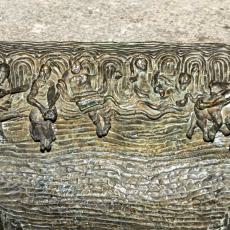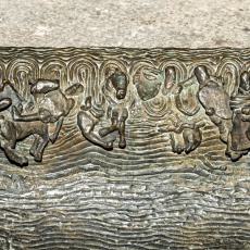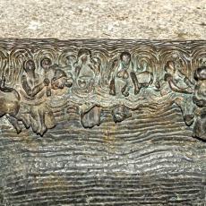 Das Volk Gottes wird durch das Wasser schreitend gerettet, während die Ägypter im Wasser umkommen. Das ist ein vielsprechendes Sinnbild der Taufe: Der Getaufte stirbt mit Christus der Sünde und erfährt durch ihn das Auferstehen-dürfen zum Leben Gottes; Taufe als Abstieg und als Aufstieg (angedeutet auch durch die Stufen, die zum Taufstein hinabführen und dann wieder hinaufführen). – In den Darstellungen des Taufbeckens ist die Quadratur des Kreises erkennbar (das Vollkommene und das Vollendende); das alles durchkreuzende, heiligende Kreuz; das Chaotische in den Wasserbewegungen wird zur gesegneten Ordnung; die Ströme des Lebens erquicken und machen lebendig den Getauften durch die sieben Sakramente.