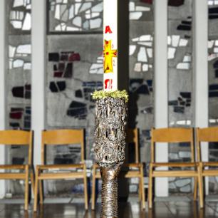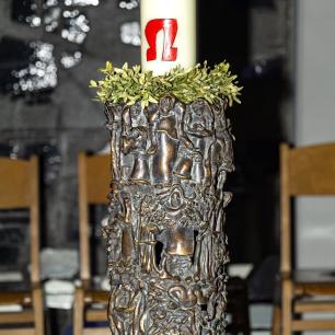Jakob, Mose, David, Salomon). Im oberen Ring werden Leben und Sendung Jesu deutlich: Jesu Menschwerdung; Jesus, der Lehrer im Tempel; Jesus bei der Hochzeit zu Kana, bezeugend, schon ist die Hochzeit mit dem Lamm angebrochen; Jesu Einzug in Jerusalem als der wahre König; Jesu Rettungstat durch seinen Kreuzestod. Über allem dann die leuchtende Osterkerze: „Ich lebe, und auch ihr sollt leben!", spricht Jesus (Joh 14,19).