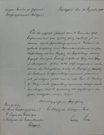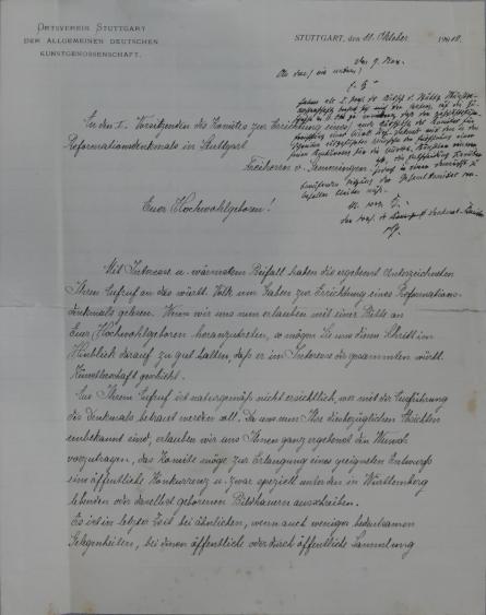 Auf die geschätzte Zuschrift vom 18. November 1910 beehren wir uns seiner Exzellenz ganz ergebenst zu erwidern, daß die Gesamtkirchengemeinde Stuttgart die geplante Errichtung eines Reformationsdenkmals und seine Aufstellung auf dem Vorplatz der Hospitalkirche freudig begrüßt und gerne bereit ist, dasselbe in Besitz und Pflege zu übernehmen. Es darf hierbei wohl angenommen werden, daß wie die Unterhaltung, so auch die Verfügung hinsichtlich des Denkmals der Gesamtkirchengemeinde zukommen soll, zu welchem Zweck wir in erster Linie die Abtretung des Platzes an die Gesamtkirchengemeinde wünschen würden. Im übrigen wird die Erörterung von Einzelfragen für später vorbehalten werden dürfen.