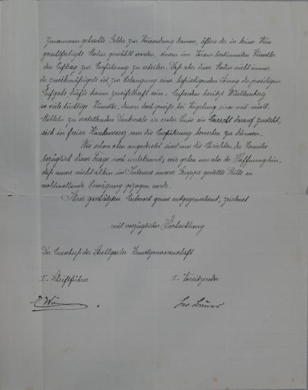 D. Merz berichtet über die Vorverhandlungen, die von ihm und den H. Eisenlohr, Elsässer u. v. Haug bezüglich des Künstlerwettbewerbs geführt worden sind u. ihrem Ergebnis er vorträgt. Der Ausschuß ist einstimmig einverstanden damit, daß jetzt eine Konkurrenz unter den in Württemberg ansässigen oder geborenen Künstlern eröffnet wird, ebenso mit dem Wortlaut der Ausschreibung, nur daß statt der vorgesehenen 800 M Honorar für die 4 besten Vorentwürfe je 1000 M beschlossen werden.