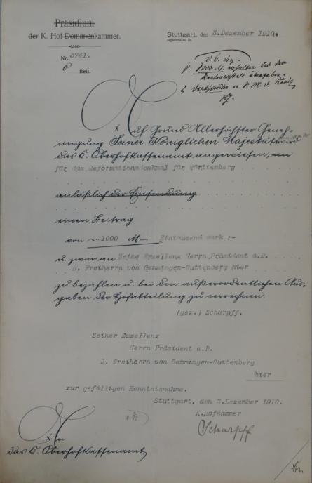 (handschriftlich rechts:) a. 6. Dez. 1000 M. erhalten und der Rentenanstalt übergeben. Dankschreiben an S. M. d. König. vG.
