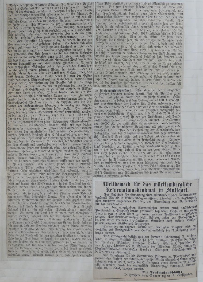 Als in der Protestversammlung gegen die päpstliche Borromaeus-Enzyklika in der Stuttgarter Liederhalle am 15. Juni in der Schlussansprache die Errichtung eines Reformationsdenkmal in Stuttgart gefordert wurde als eine Tat des Protestes gegen die zügellosen Beschimpfungen der Reformation und der Reformatoren, da zeigt der jubelnden Beifall der versammelten Tausende, was für einen Widerhall dieser Gedanke fahnd und auf welch breiten Boden er rechnen darf, wenn er jetzt mit tatkräftiger Energie weiter verfolgt wird. Der Gedanke selbst ist ja schon über ein Jahrzehnt alt und ist seinerzeit durch das Studium von mancherlei Verhandlungen hindurchgeführt und auch zu einem vorläufigen befriedigenden Abschluss gebracht worden. Eingeweihte erinnern sich, dass ein Platz am Alten Schloss mit der Front gegen das Kaiser Wilhelm Denkmal ins Auge gefasst war, dass man dann gerne den Platz bei der Garnisonkirche gehabt hätte, auf dem früher das Panoramagebäude stand, der aber von der Stadtverwaltung nicht zur Verfügung gestellt wurde. Endlich kam man – und das war ein Lieblingsgedanke des auch für diese Sache zu früh abgerufenen Stadtdekan Dr. von Braun, eines der warmherzigsten Förderers des Denkmalgedankens – auf den Platz an der Hospitalkirche, und das Projekt nahm bereits greifbare Gestalt an, sofern man an einem Kruzifix dachte, zu dessen Füßen die Reformatoren sich sammeln. Aber nun scheint seit einer langen Reihe von Jahren der Denkmalsgedanke zu ruhen. Es hat nicht an Stimmen gefehlt, die seine Auferweckung forderten. Man erinnerte daran, dass es eine Ehrenpflicht des schwäbischen Protestantismus sei, am 31. Oktober 1917 nicht mit leeren Händen dazustehen, und daß 10 Jahre für die weitsichtigen Vorarbeiten eines solchen kostspieligen Denkmals nur eine kurze Spanne Zeit seien. Nun sind von diesen 10 Jahren wieder fast 3 vergangen! Wenn die Stimmung, die durch das evangelische Volk jetzt in diesen Tagen geht, nicht benutzt, wenn das Eisen nicht geschmiedet würde, solange es heiß ist, dann könnte ruhig der ganze Denkmalsgedanke zu den Akten gelegt werden, dann müsste aber seinerzeit von der Geschichtschreibung über die Generation, über die die Borromaeus=Enzyklika ergangen ist, gesagt werden: Man hat gegen die Enzyklika mit Worten auch in Stuttgart protestiert, man hat damals und schon vorher für Stuttgart ein Reformationsdenkmal geplant, aber man hat den Mut und die Energie nicht gefunden, es auszuführen, und man hat insbesondere den richtigen Moment, wo es zu machen gewesen wäre, verpaßt! Und das wäre kein Lob für den schwäbischen Protestantismus, in welchem es sich in diesen Tagen allenthalben regt nach einer Tat des Protestes. Deswegen war es ein erlösendes Wort, dass in der Versammlung am 15. Juni mitgeteilt wurde, der Vorsitzende des Komitees für das Stuttgarter Reformationsdenkmal habe geäußert, das nach seiner Ansicht der Gedanke desselben jetzt kräftig wieder in Angriff genommen werden müsse. Das ist ein Wort, dass seine Einlösung durch die protestantische Bevölkerung verlangt und, wie wir nicht zweifeln, auch demnächst finden wird.