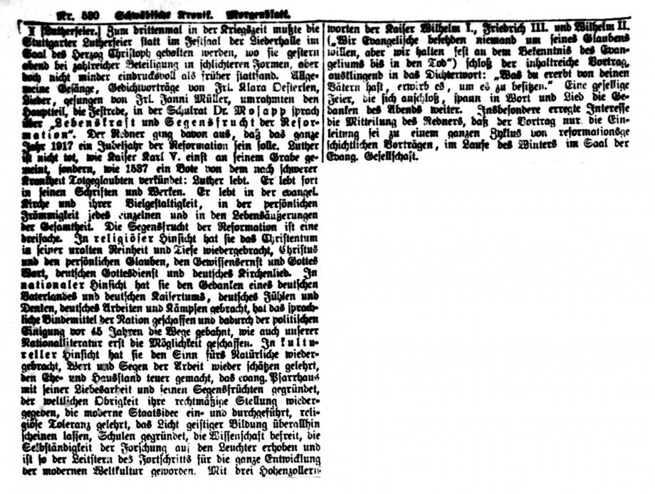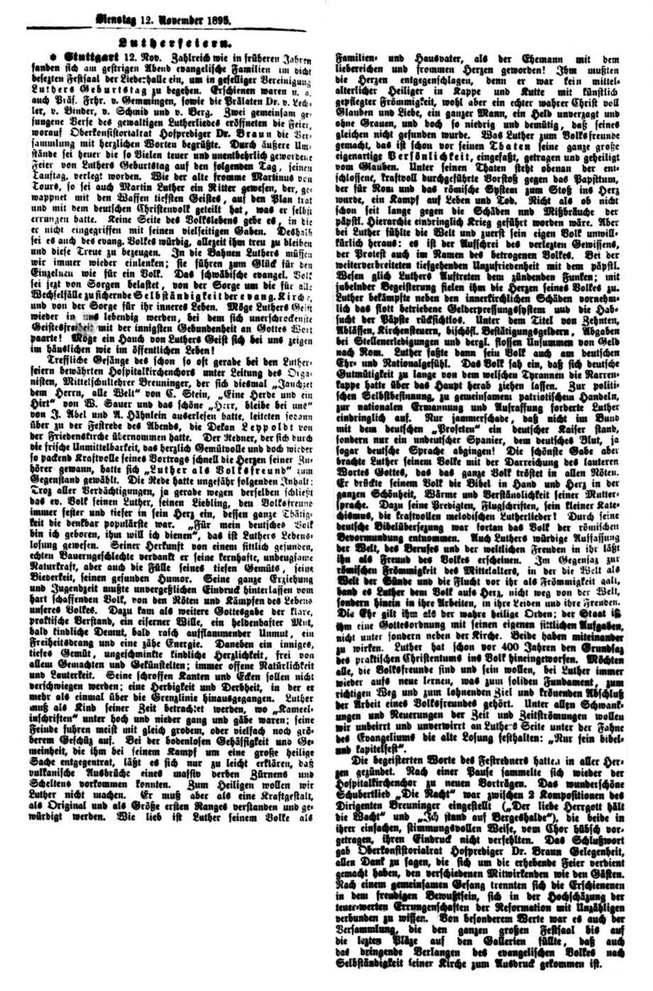Nach dem großen Gedenkjahr 1883 findet jährlich im November eine Luther-Feier in Stuttgart statt, über die auch die Schwäbische Kronik berichtet (1899 + 1915 fehlen). Da die Ausgaben 1884 in sehr schlechtem Zustand sind, hier eine Abschrift, danach Scan von Mikrofilmen in der WLB Stuttgart: