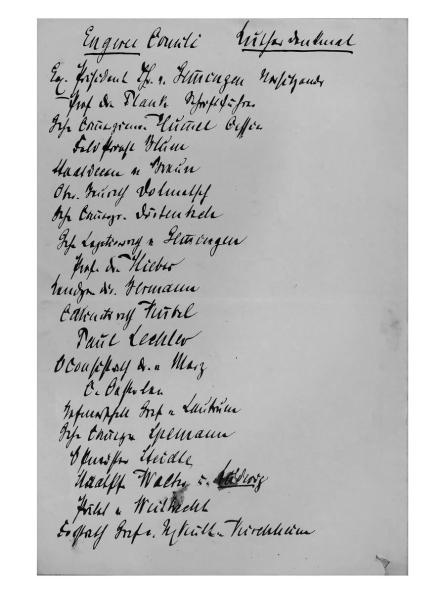 Anwesend sind: der Vorsitzende, Präs. V. Gemmingen; Prälat v. Weitbrecht, Feldprobst Blum, Stadtpfr. Dr. Walther, Prof. Dr. Planck, ObKonsist. Dr. Merz, Prof. Th. Fischer, Oberpostmeister Steidle, Geh. Komrat Hummel, Oberbaurat v. Reinhardt, O.baurat Dolmetsch, Graf Uxkull, Stadtdekan Braun.