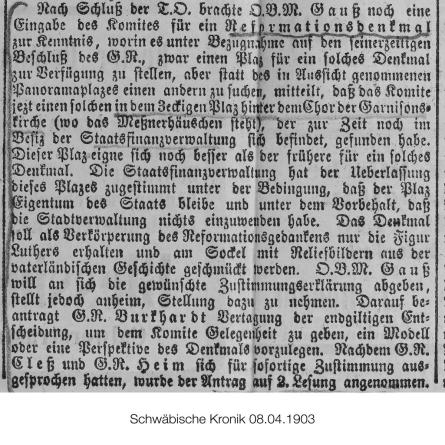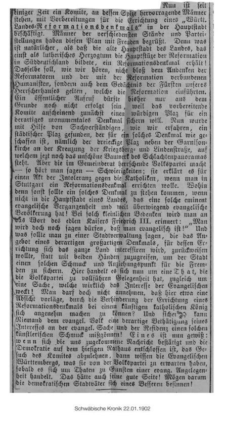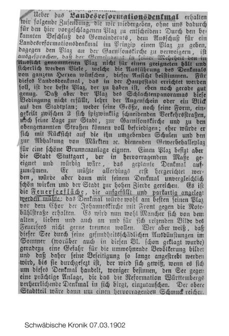 Es ist etwa ein Jahrzehnt her, daß der Gedanke eines solchen erwogen wurde. Ein Komitee, in welchem die verschiedensten Kreise der Gesellschaft sich einmütig zusammenfanden, hatte die Vorbereitung in die Hand genommen; Gelder wurden gesammelt; die Platzfrage hatte nach mancherlei fehlgeschlagenen Versuchen eine glückliche Lösung gefunden; ein Projekt eines namhaften Künstlers lag vor, kurz es schien alles im schönsten Gang, und die Freunde des Gedankens freuten sich darauf, in absehbarer Zeit in diesem Denkmal zum Ausdruck gebracht zu sehen, welchen tiefen Dank das Land Baden-Württemberg und die Stadt Stuttgart den Segnungen der Reformation schulde.