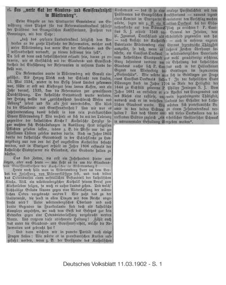 Am 31. Oktober 1517 hat Martin Luther seine welterschütternden Schläge an die Schloßkirchentür in Wittenberg erdröhnen lassen, mit welchen eine völlig neue Epoche des Lebens unserer Nation begann. Denn darüber sind heute alle Einsichtigen einig, daß die Reformation nicht bloß auf religiösem Gebiet eine Erneuerung brachte, sondern daß sie dem ganzen Geistes= und Kulturleben Deutschlands, ja Europas, die kräftigsten Impulse gegeben hat, daß auf ihrem Grunde allein unsere klassische Literatur möglich war, daß auf ihren Schultern allein das neue Deutsche Reich entstehen konnte. 10 Jahre trennen uns heute noch von dem Jubeltag, an welchem das 400jährige Gedächtnis des Anfangs der Reformation durch ganz Deutschland festlich begangen werden wird. Sollte nicht zu diesem Festtage Stuttgart endlich sein Reformationsdenkmal haben?