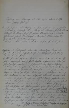 Quelle: Protokollbuch S. 1 – 3, handschriftlich, Sütterlin, schwer lesbar.