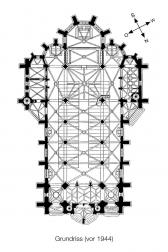Durch Luftangriff starke Zerstörungen an der Kirche (Gewölbe und Ostwand). |
