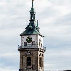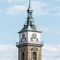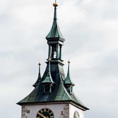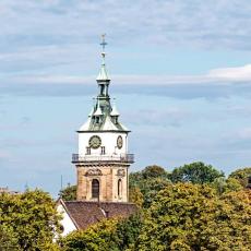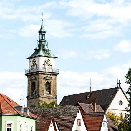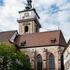"Heinrich Schickhardt erbaute in den Jahren 1612 bis 1613 den heutigen Renaissance-Turm als Ersatz für den ursprünglich niederen gotischen Turm. Neben seiner Schönheit ist der Turm auch eine technische Meisterleistung. Der Steinturm hat im Innern einen zweiten Turm aus schweren Hölzern, der die Schwingungen der Glocken auf die Fundamente hinableitet und so den äußeren Turm entlastet."