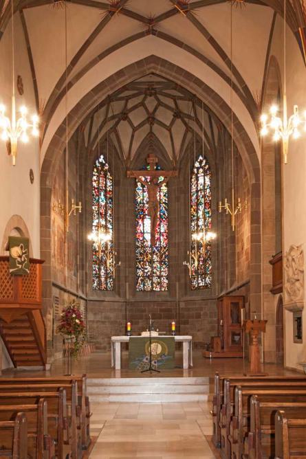 Der Chor besteht aus zwei ungleich langen Vorjochen, denen sich im Osten ein fünfseitiges Chorpolygon anschließt. Das spätgotische Rippengewölbe befindet sich in originalem Zustand. Die Gcwölbefiguration mit drei zentralen Sternfiguren zeichnet sich durch eine große technische und ästhetische Einheitlichkeit aus und ist ein Höhepunkt im Werk Aberlin Jörgs. Er hat sich mit seinem Sternenwappen im östlichsten Schlußstein des Chores verewigt. Seitlich befinden sich die Schilde der beiden Nebenmeister, die den Bau vor Ort leiteten.