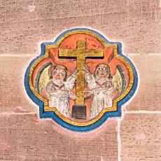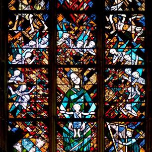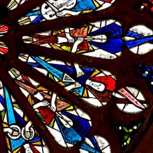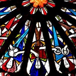"...Die Rosette über dem Westportal zeigt in 16 Segmenten Engel mit verschiedenen Musikinstrumenten. Die Rosette erscheint so im Thema wie auch in der Form der Orgel harmonisch zugeordnet." (Kirchenführer)