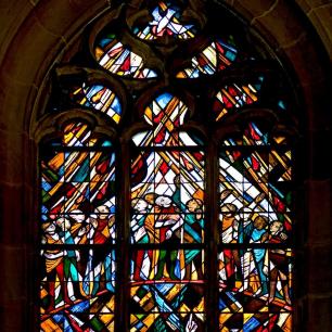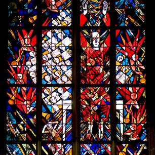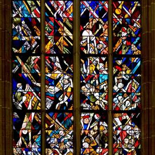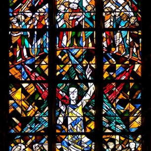 Das mittlere Fenster schließlich zeigt die Erfüllung beider Schriften nach der „Offenbarung des Johannes": Christus als wiederkehrender Weltenrichter beim Jüngsten Gericht. Darüber ist das Ziel aller Gläubigen, das ewige Leben im Reich Gottes, in der Himmlischen Stadt Jerusalem, dargestellt.