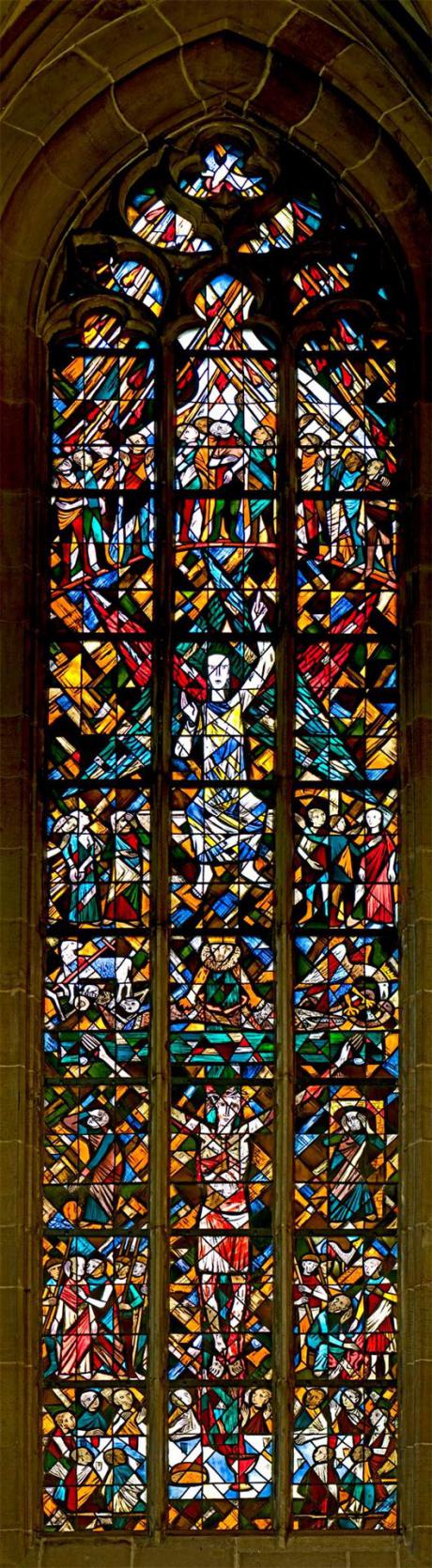 Sie wird im rechten Fenster mit dem irdischen Leben, mit Opfertod und Auferstehung Jesu Christi nach dem Neuen Testament fortgesetzt.