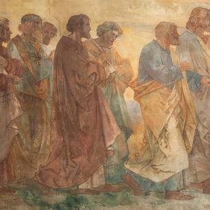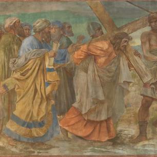 A Wandgemälde, 1906, von Rudolf Yelin d. Älteren: „Erste Leidensankundigung" und „Kreuztragung"