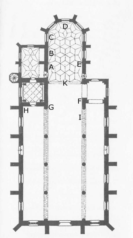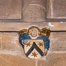 Die Schlußsteine im Chorgewölbe, im Turmerdgeschoß und in der Sakristei sitzen an ihren ursprünglichen Stellen. Die heute an den Seitenwänden eingemauerten fünf Schlußsteine stammen aus dem originalen, 1791 abgebrochenen Langhausgewölbe. Sie wurden 1905 an ihren jetzigen Standorten eingesetzt.