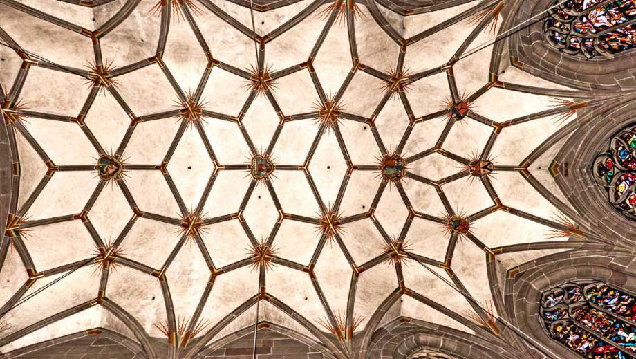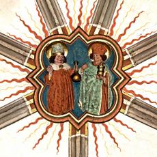 Der Begriff Schlußstein bezeichnet bautechnisch den letzten Stern im Scheitel eines Gewölbes, der die Wölbung nach oben abschließt. Gemäß seiner konstruktiven und ästhetischen Bedeutung wird er in der Spätgotik mit farbig gefaßten, figürlichen Reliefs verziert